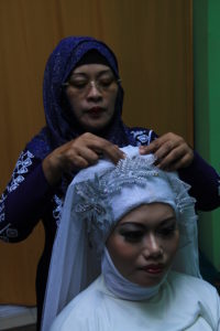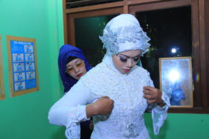 Akad nya di lakukan pada Hari Minggu Tanggal 08 Juni 2014 Jam 07.00 WIB di Aula Mesjid Jami Darul Hikmah Jakarta Selatan. Mas Soleh (Kali ini udah ga perlu sebut pake inisial lagi 😀 ) datang bersama bapak dan ibunya pada hari Sabtu dini hari jam 00.00 WIB menggunakan kereta . Mereka turun di Stasiun Jatinegara, dan dari Stasiun Jatinegara naik taksi langsung menuju kost an bunbun di daerah Mampang Prapatan Jakarta Selatan. Istirahat bareng2 di kost an trus besok paginya setelah sarapan langsung ke rumah bunbun di daerah Srengseng Sawah. Dari Mampang Prapatan ke Srengseng Sawah via Taksi. Sampai di rumah bunbun, orang2 udah pada rame buat bantuin ngerewang. Karena nanti malam nya mau ada pengajian dan ruwatan di rumah bunbun. Kalo menurut adat jawa, karena berhubung bunbun anak tunggal jadinya sebelum nikah harus di ruwat terlebih dahulu. Ga tau juga sih maksudnya supaya apa. Tapi sih intinya sih cuman di ngajiin dan dibacain doa aja, ga sampe ada tuh yang namanya mandi kembang2an segala. Setelah pengajian dan ruwatan berjalan dengan lancar, malam nya bunbun ngecek untuk persiapan dekorasinya, dan Alhamdulillah sudah hampir selesai dengan sempurna semua. Semua saudara2nya mas Soleh yang dari Banjarnegara menginap di penginapan ga jauh dari lokasi acara. Setelah semuanya beres, kita semua istirahat dan kembali lagi ke tempat acara besok ba’da shubuh jam 05.00 untuk persiapan rias.
