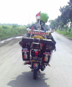 Kita berangkat dari kontrakan nya mas soleh di Daerah Singosaren Yogyakarta ba’da shubuh. Jam 05.00 kita berangkat. Dan 3 jam kemudian tepat pada pukul 08.15 WIB kita berdua baru sampai di Daerah Kebumen, dan kita istirahat di sana sambil mencari sarapan sebelum melanjutkan perjalanan kembali. Setelah selesai sarapan di Kebumen, kami melanjutkan perjalanan kembali. Hingga akhirnya pas di Brebes kami melihat 2 orang yang sedang touring Jakarta-Banyuwangi PP.