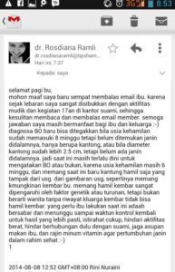 Duuh, ga tau deh gimana rasanya saat itu. Saat menunggu waktu 2 minggu itu. Antara senang, bahagia, bingung, dan cemas semuanya bercampur menjadi satu. Sampe2 mencari sumber kesana kemari apa yang sebenarnya terjadi dengan kehamilan ku ini. Sampe2 akhirnya pas cari2 info di internet, ketemu lah dengan salah satu SpOG yang buka konsultasi online seputar kehamilan dr. Rosdiana Romli, Sp.OG . Akhirnya sempat kirim email ke beliau. Dari sejak kirim email sampai dibalas nya itu kurang lebih hampir 1 minggu lebih baru dibalas, mungkin karena beliau saking sibuknya dan saking banyaknya pertanyaan yang masuk ke beliau.