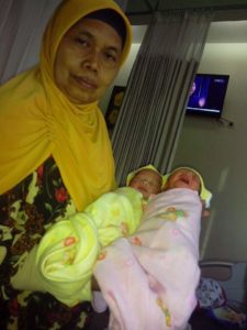 Dan akhirnya 09.30 WIB operasi sc pun dimulai. Ayah ga boleh masuk disuruh nunggu di luar sama keluarga yang lainnya. Dag dig dug dan keringet dingin itu yang dirasain saat itu. Belum apa2 udah ngerasain sakitnya disuntik dalam posisi bungkuk, di suntik di bagian tulang belakang. Bius epidural ya kalo ga salah namanya, yang fungsinya untuk membuat bunbun ga bisa merasakan sakit di bagian tubuhperut sampai bawah. Bunbun tuh sampe teriak itu antara kaget dan sakit. Abis itu bunbun udah ga ngerasin apa2 lagi kecuali satu DINGIN. Ntah itu karena faktor AC atau emang suhu tubuh bunbun yang lagi dingin banget, dan saat itu pun bunbun masih dalam keadaan sadar. Tubuh bunbun juga dipasang kateter untuk menampung urine selama operasi, dan juga dipasang selang infuse saat sebelum operasi tadi dimulai. Selain itu pubis nya juga dicukur untuk memudahkan jalan saat dilakukan sayatan. Pas ngeliat muka bunbun yang tegang akhirnya dokter nya ngajak bunbun ngobrol, dan bunbun lupa apa yang diobrolin pokoknya hanya untuk mencairkan suasana aja supaya bunbun ga keliatan tegang. Sepintas bunbun lihat dari pantulan lampu operasi apa yang sedang dilakukan oleh tim dokternya.. Dan akhirnya pas tiba2 pas lagi ngobrol2 sama dokternya, Oeeeeeekkk Oekkkkk, terdengarlah suara tangisan bayi pertama. Dan kemudian disusul dengan suara tangisan bayi kedua. Duuhhhh Ya Allah, itu tuh rasanya seneeeeng bangett , plong banget. Kedua bayi kembar nya bunbun langsung di pegang sama dokter anak dan perawat nya untuk segera dibersihkan, sementara bunbun ditangani oleh obgyn nya untuk dikeluarkan plasentanya dan di jahit kembali untuk menutup sayatan yang terbuka tersebut. Lega banget rasanya saat itu. Dan setelah kedua bayi dibersihkan perawatnya ngasih liat kedua jagoan kembar bunbun ke bunbun, dan bunbun disuruh mencium mereka. Duuhhh, Ya Allah saat melihat jagoan kembar ku untuk yang pertama kalinya , saat itu masih belum percaya juga, kalo aku ternyata telah melahirkan anak kembar laki2 pula. Bayi pertama lahir pada pukul 09.59 WIB dengan berat 1.95 Kg sedangkan bayi yang kedua lahir pada pukul 10.02 WIB dengan berat 2 Kg. Setelah proses operasi sc selesai, bunbun dibawa ke ruang pemulihan. Disitu bunbun ditemani sama ayah. Si jagoan kembar masuk di incubator. Saat ini efek bius nya masih ada, jadi masih belum kerasa sakitnya. Kemungkinan 1 jam lagi bius nya akan hilang. Dan bunbun pun harus siap2 menahan rasa sakit dan nyerinya. Hampir 1 jam ada di ruang pemulihan. Dan kira2 sekitar jam 13.00an bunbun baru dipindahkan lagi ke ruang perawatan. Sementara si jagoan kembar masih berada di Inkubator.